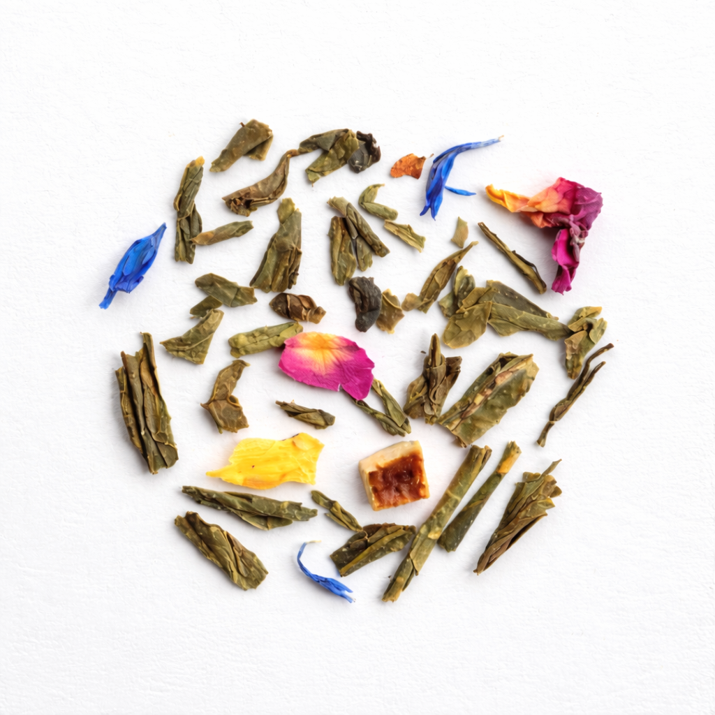 Grönt te, apelsinskal, rosenblad, blåklint, solrosblommor och arom