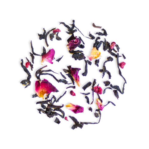 Svart te (95%), rosenblad, frystorkade hallonbitar, arom