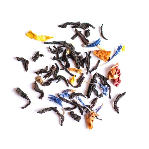Svart te: 89%, apelsinskal, rosenblad, blåklint, solrosblommor, vaniljbitar, arom