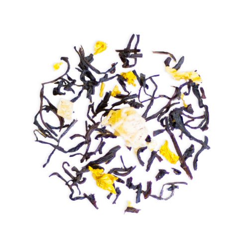 Piña Colada, the popular cocktail whose combination of coconut, dark rum and pineapple has made it Puerto Rico's national drink since 1978. We have recreated this classic taste with black tea flavored with, among other things, grated coconut and sweet pieces of dried pineapple, decorated with sunflower flowers.